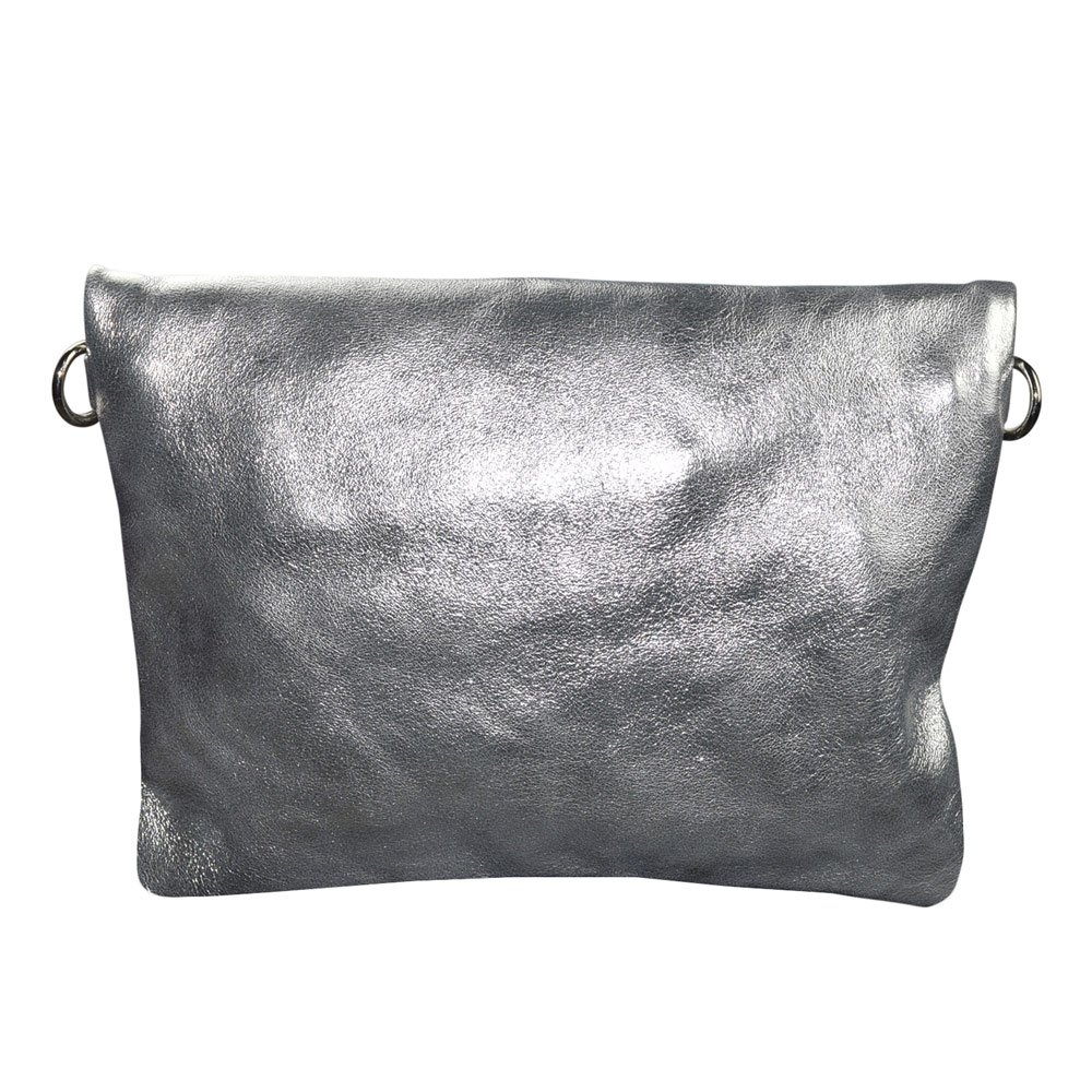 Genuine soft leather metallic silver clutch. Adjustable shoulder strap. Fully lined in polyester. Inside zippered pocket. Silver coloured hardware. 19cm Height. 29cm Width. 5cm Thickness. Adjustable, removable, shoulder strap.