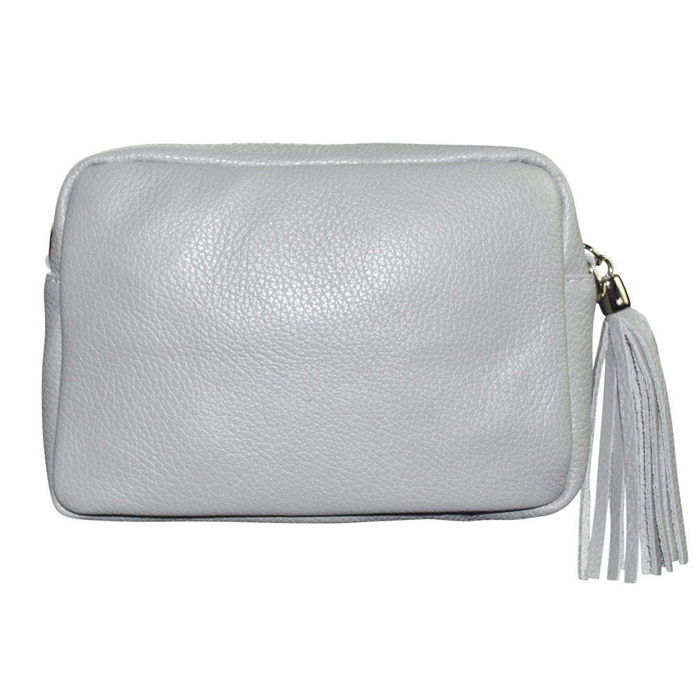 Genuine soft leather tassel clutch. Adjustable shoulder strap. Fully lined in polyester. Inside pocket. Black colour. 15cm Height. 21cm Width. 7cm Depth. Beige colour shown on model.