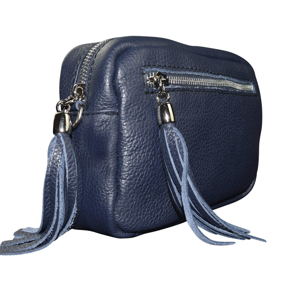 Genuine soft leather tassel clutch. Adjustable shoulder strap. Fully lined in polyester. Inside pocket. Black colour. 15cm Height. 21cm Width. 7cm Depth. Beige colour shown on model.