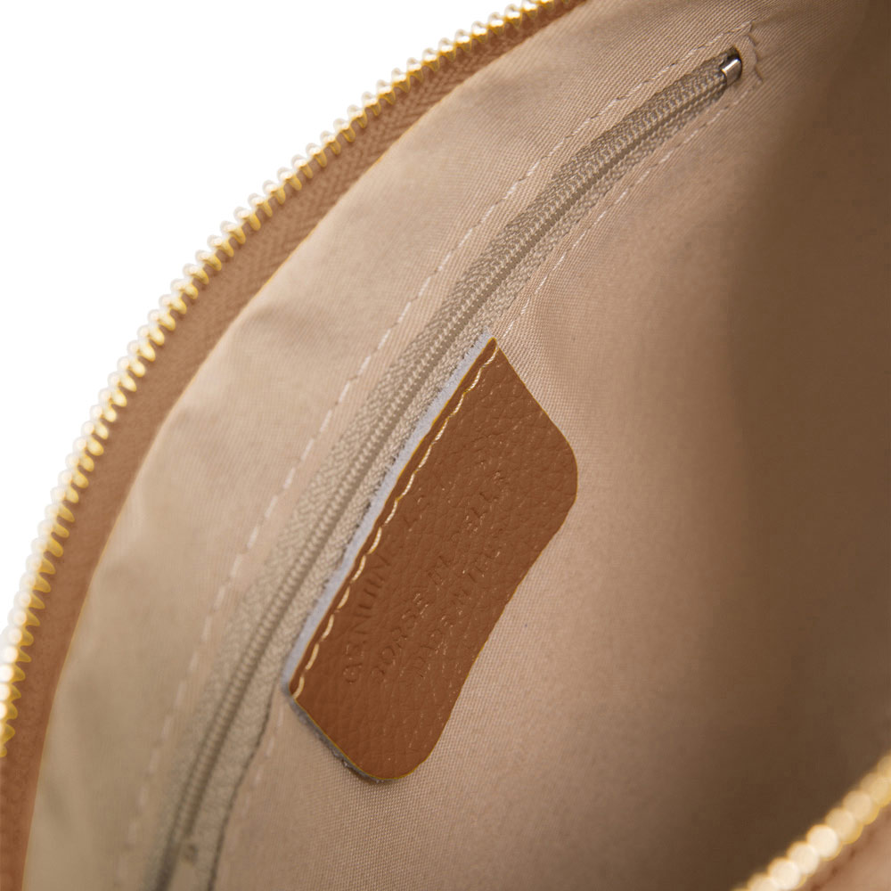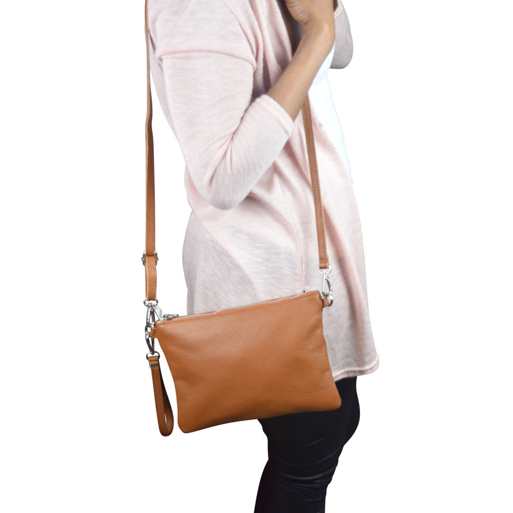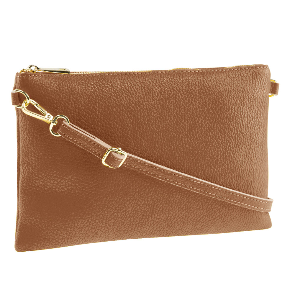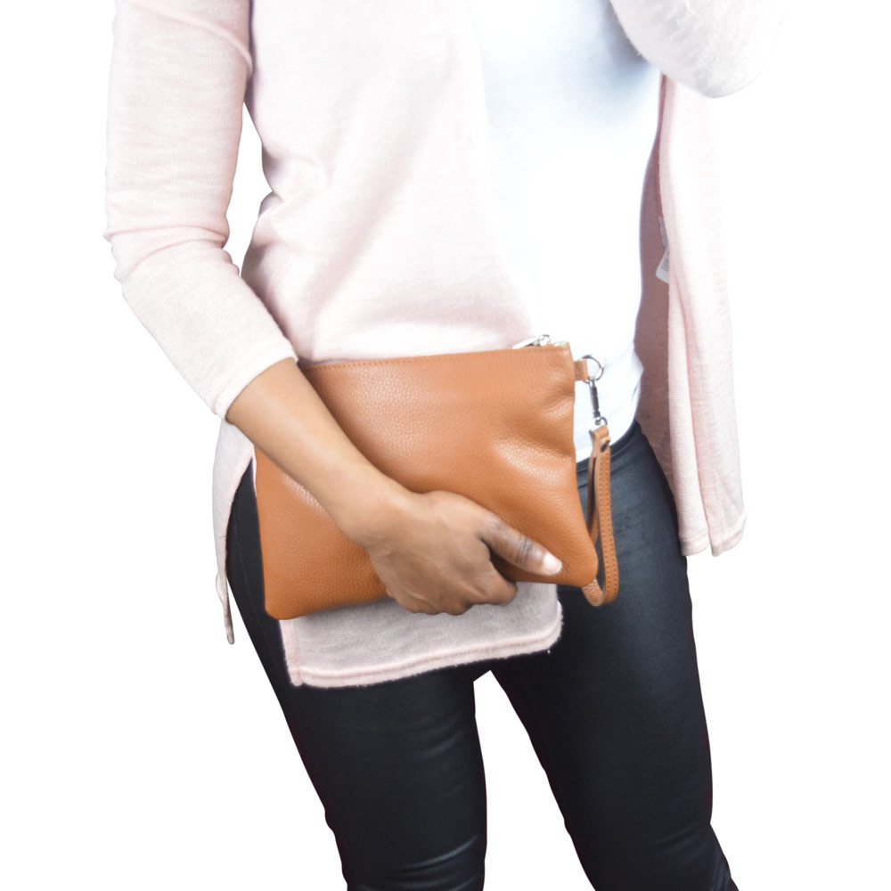 Genuine soft leather clutch. Adjustable shoulder strap. Fully lined in polyester. Wristlet strap. Inside zippered pocket. Silver coloured hardware. 18.5cm Height. 25.5cm Width. 3cm Thickness. Adjustable shoulder strap. Colour: cognac brown.