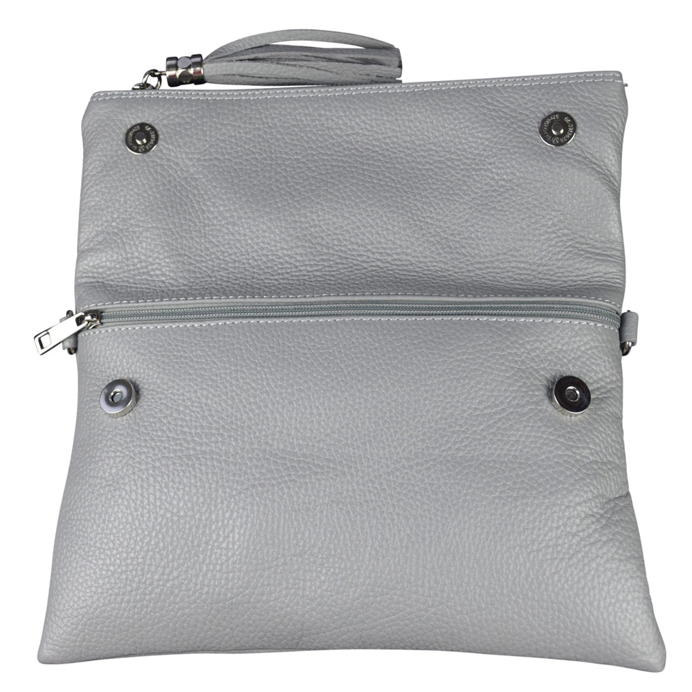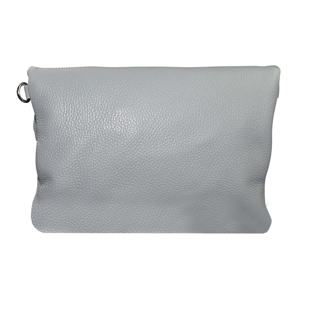 Genuine soft leather clutch. Adjustable shoulder strap. Fully lined in polyester. Inside zippered pocket. Silver coloured hardware. 19cm Height. 29cm Width. 5cm Thickness. Adjustable, removable, shoulder strap.