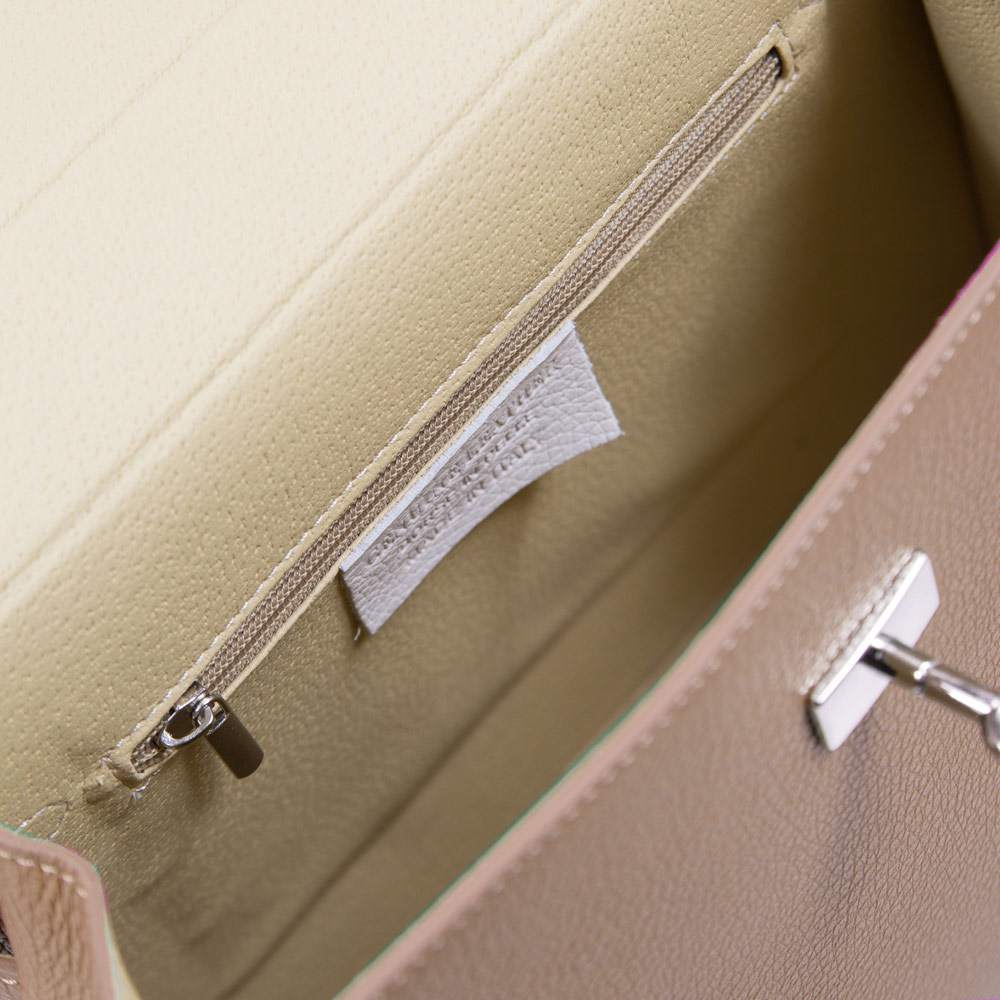 Outer: 100% soft Italian leather. Inner: 100% genuine leather. Internal pockets: vegan leather. Silver coloured hardware. Detachable shoulder strap. Removable lock and key included. Internal zip pocket. Wipe clean. Wipe clean. Colour: beige/nude with a slight blush/light pink hue. Width:31cm. Height:22cm. Depth:10cm.
