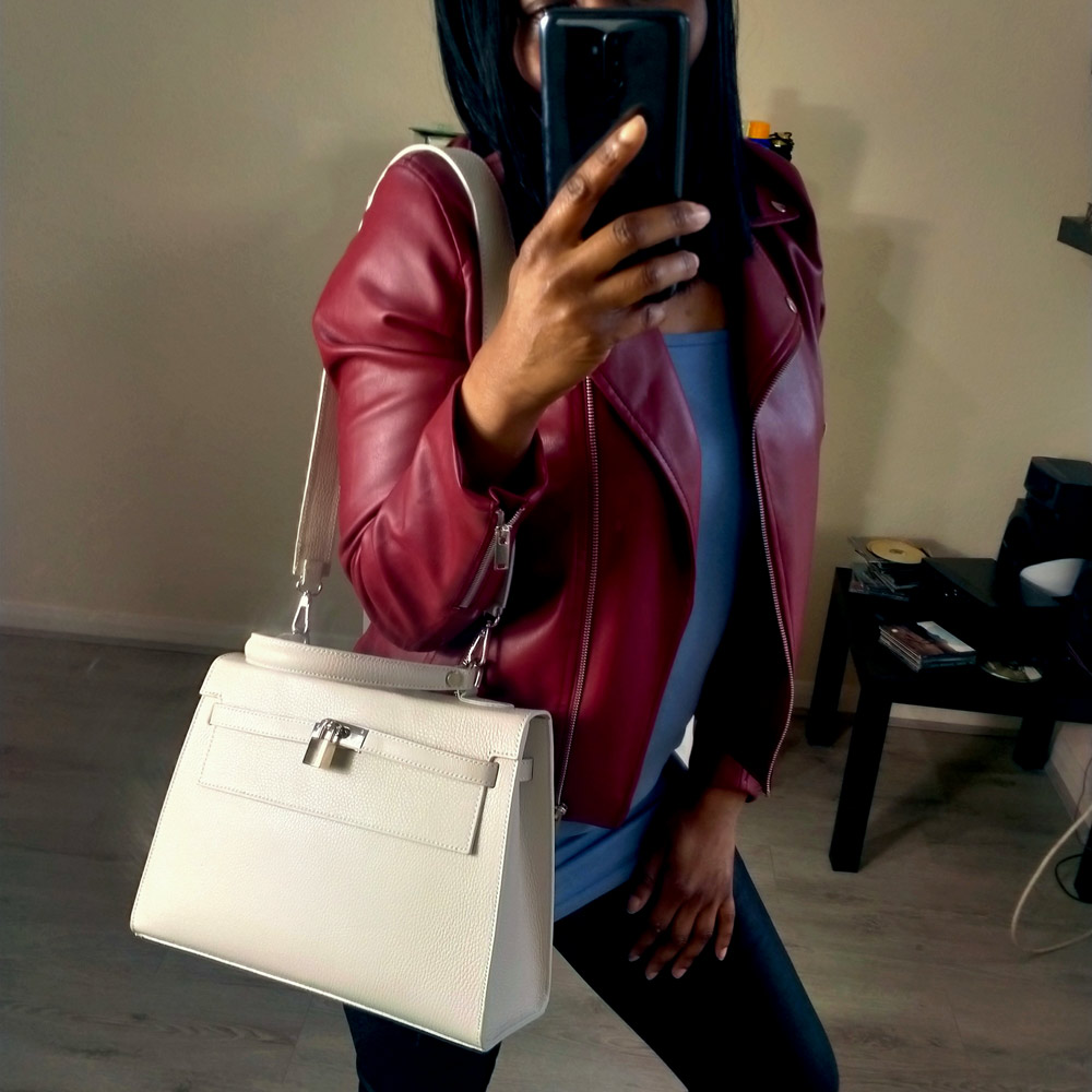 The Talia is the ultimate leather padlock tote to be seen out and about in this season. Made in Italy, this luxury, leather, top handle grab bag is unique and chic. Available in a variety of colours