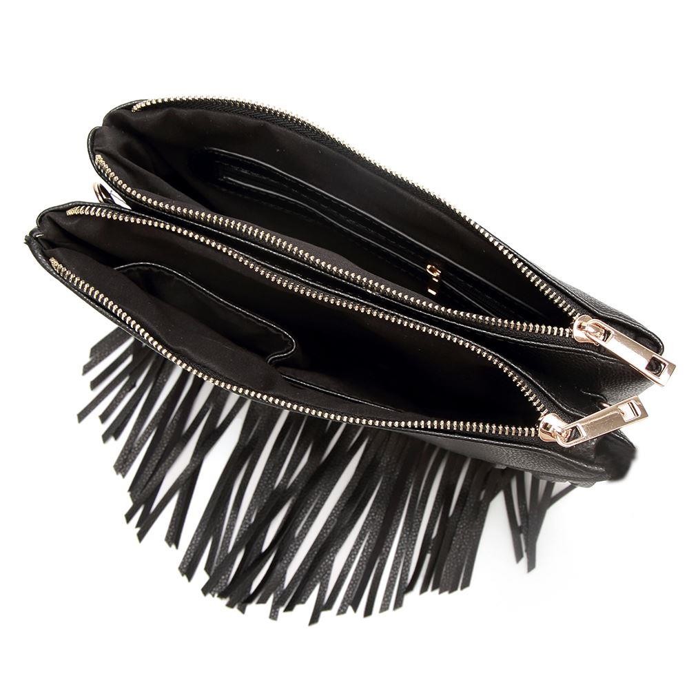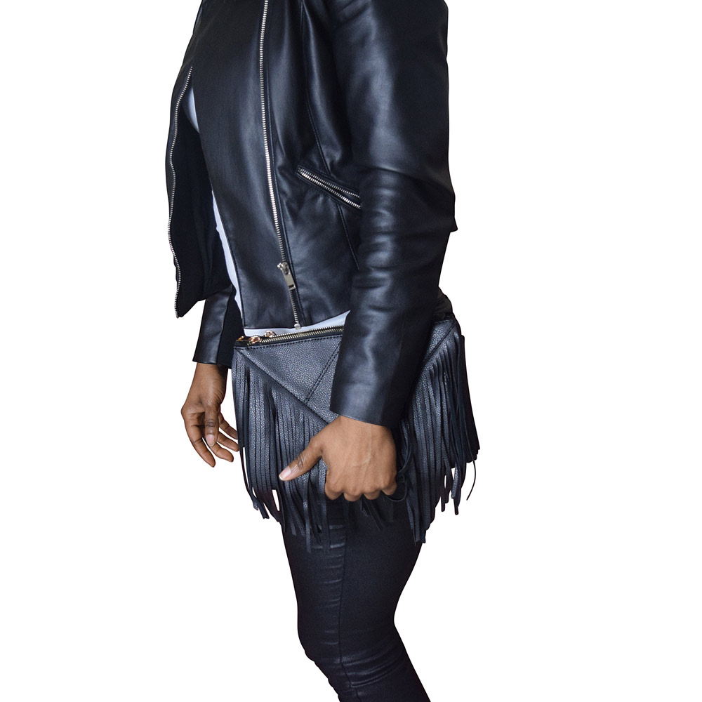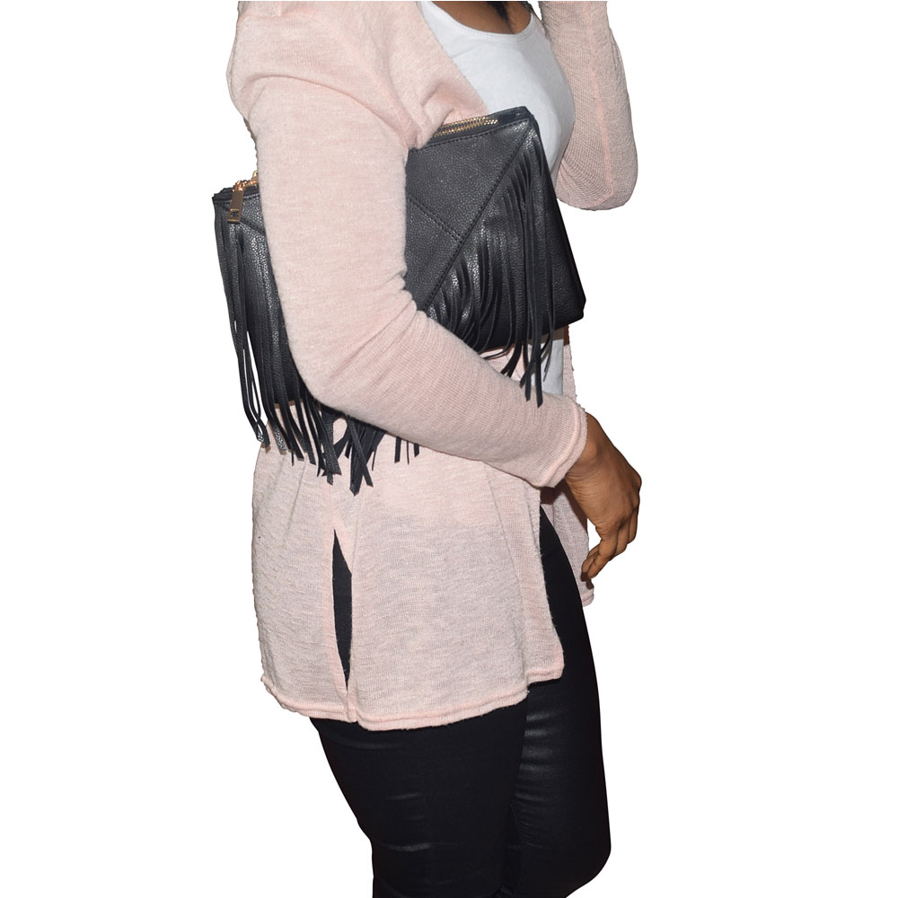 Vegan "faux" leather crossbody fringed bag. Outer: 100% polyurethane. Internal: 100% polyester. Fully lined. Fringe Tassel, Adjustable Strap, Zip Closure. Wipe clean.