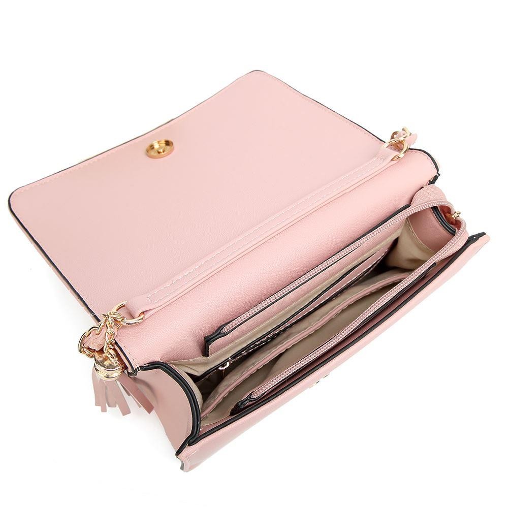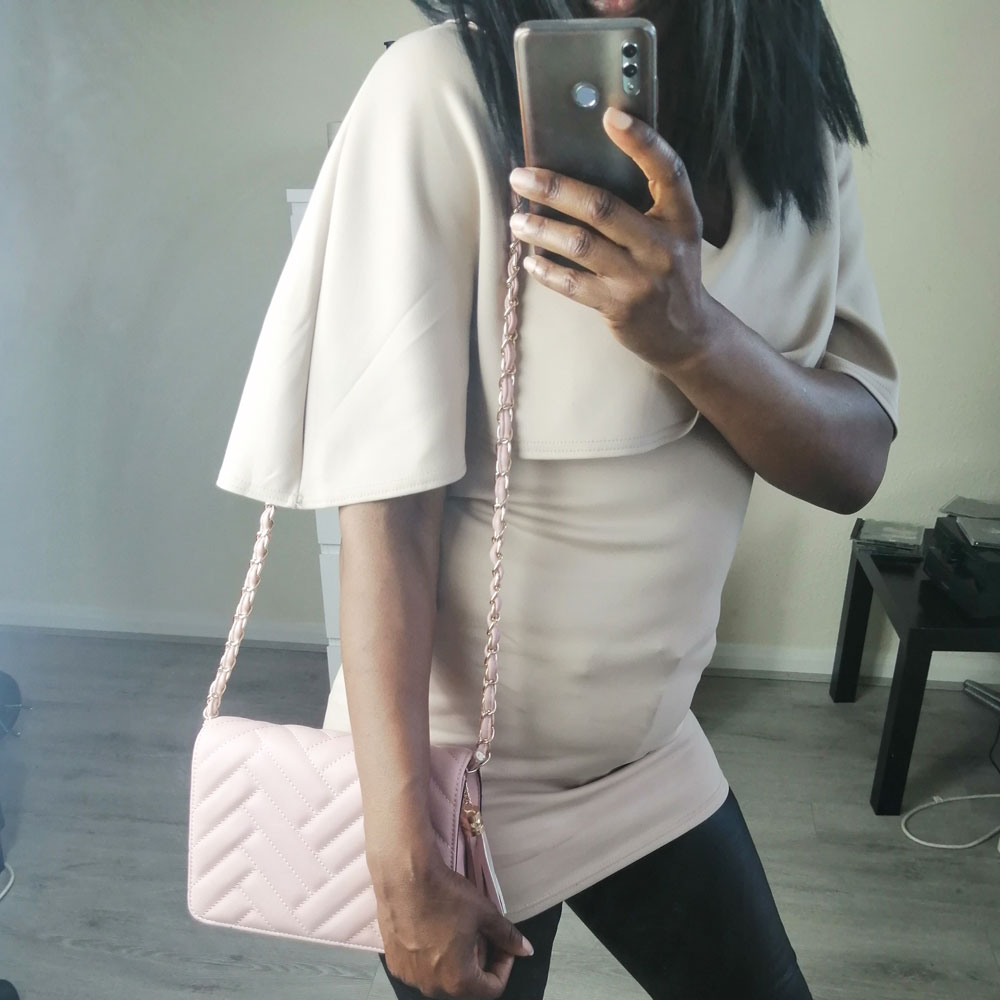 Vegan "faux" leather crossbody bag. Outer: 100% polyurethane. Internal: 100% polyester. Fully lined. Chain mix strap. Colour: blush pink. Wipe clean Width:22cm Height:17cm Depth:7cm.