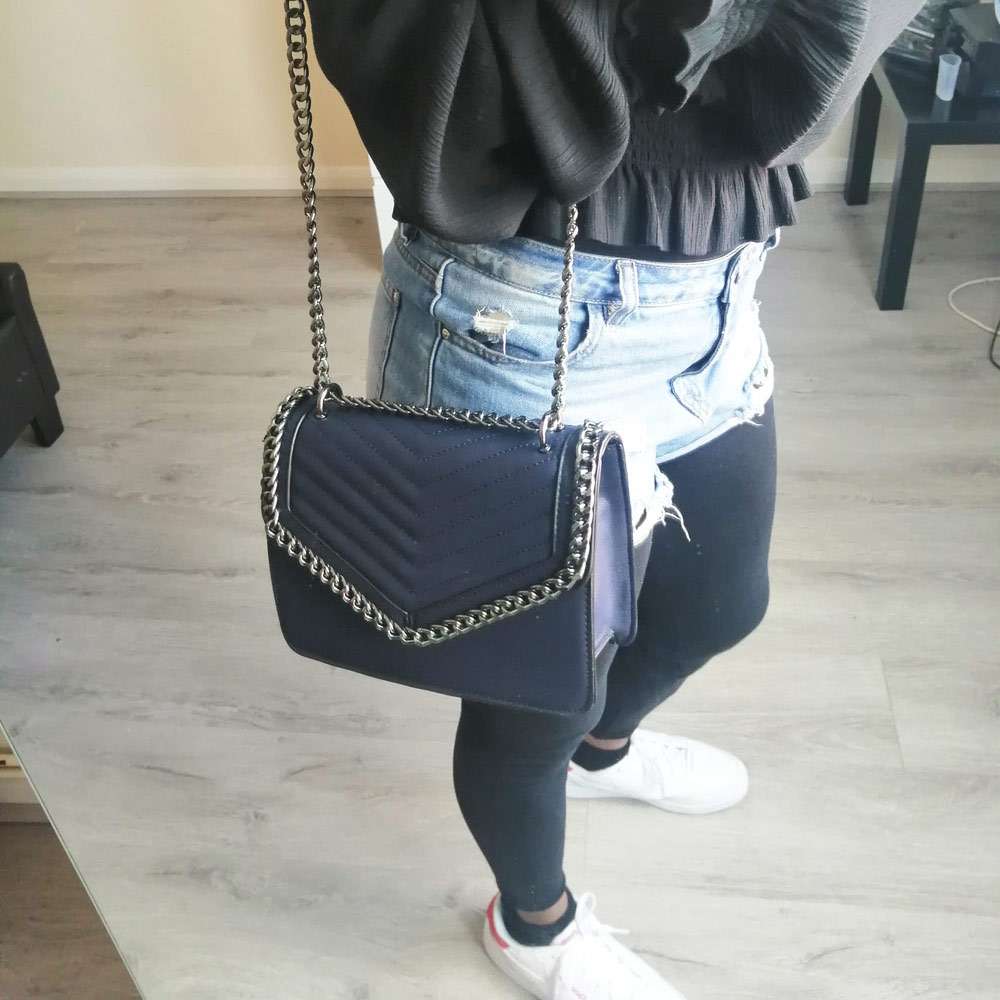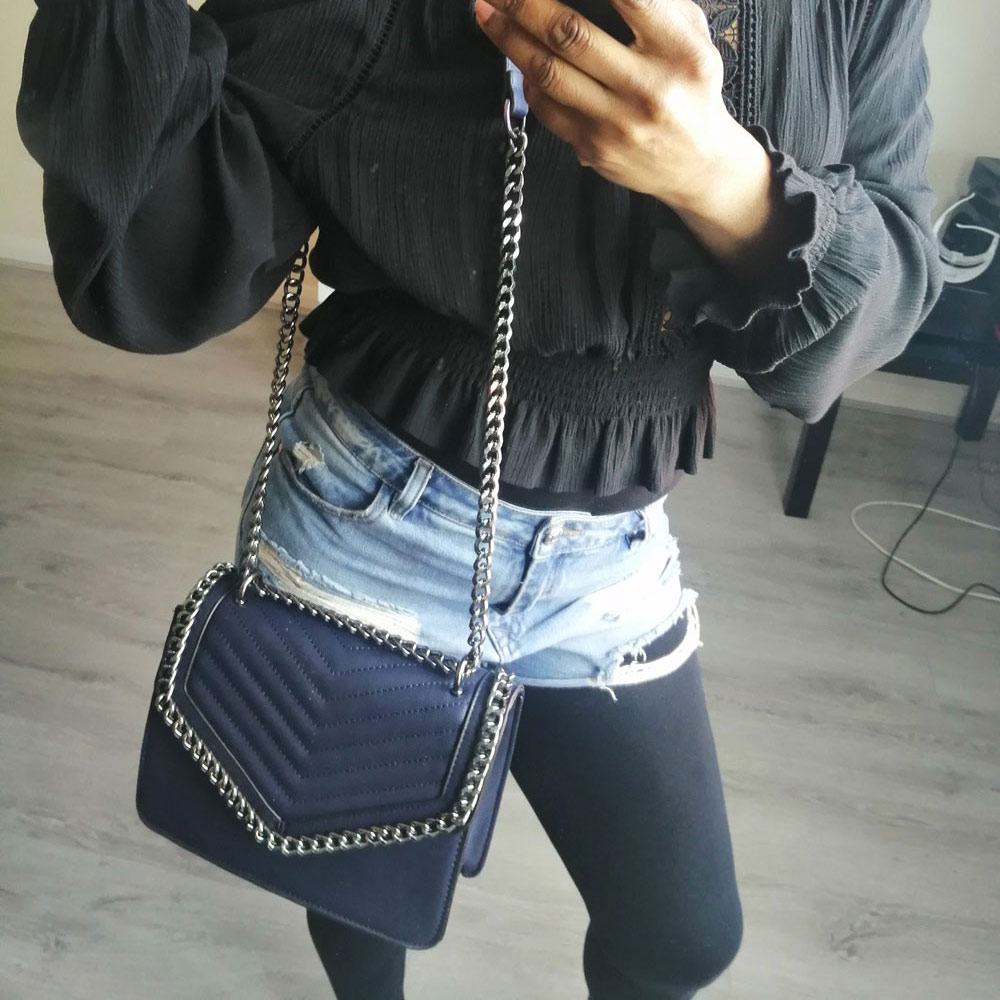 Premium quality vegan "faux" leather crossbody bag. Solid metal outer trim in stainless steel. Stainless steel crossbody chain. Outer: 100% polyurethane. Internal: 100% polyester. Fully lined. Wipe clean. Colour: navy blue. Width:23cm Height:17cm Depth:8cm.