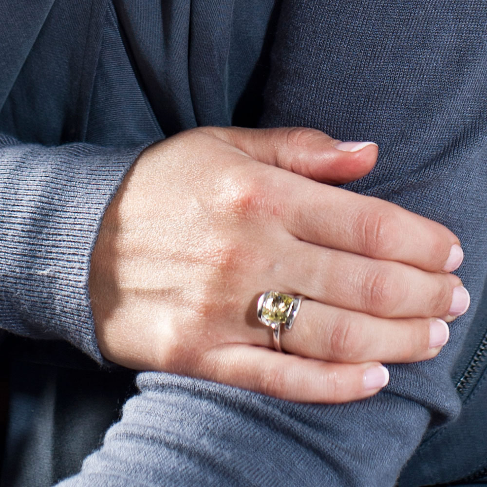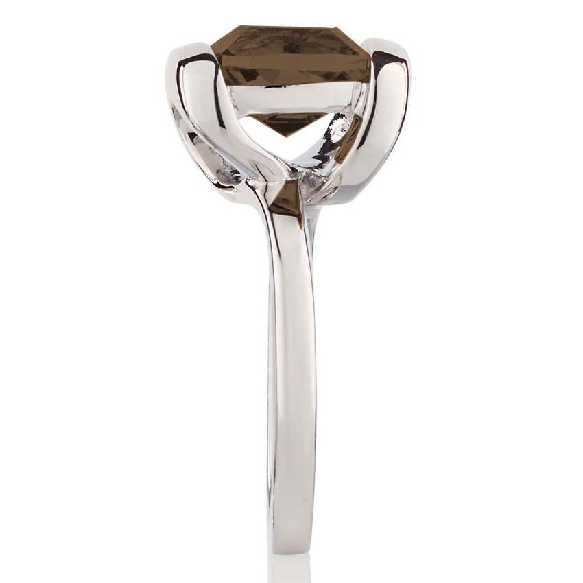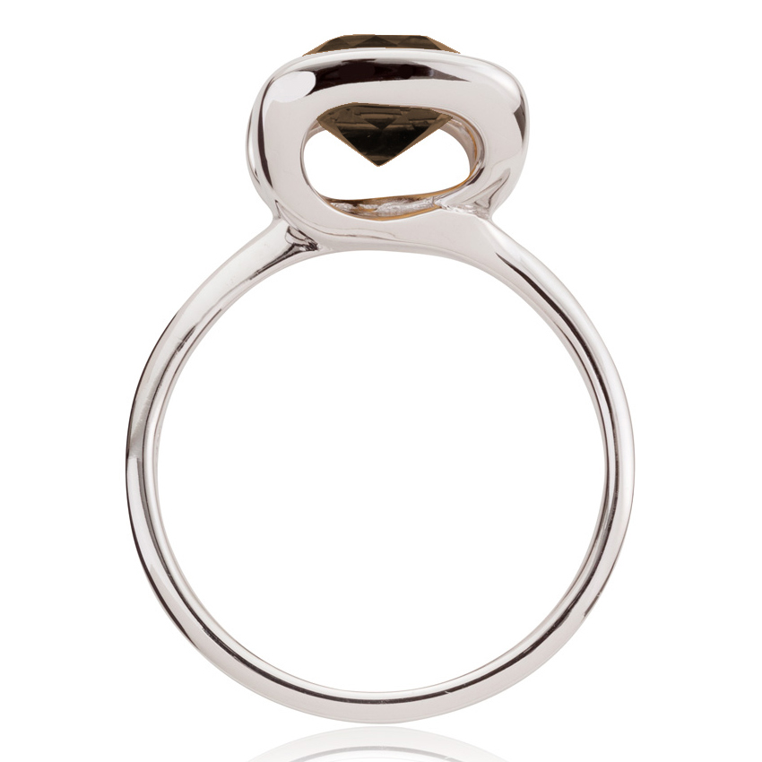 Rhodium plated sterling silver cocktail ring set with 1 x cushion cut smokey quartz gemstone. Lemon quartz setting shown on model in picture. Available in sizes K-Q.