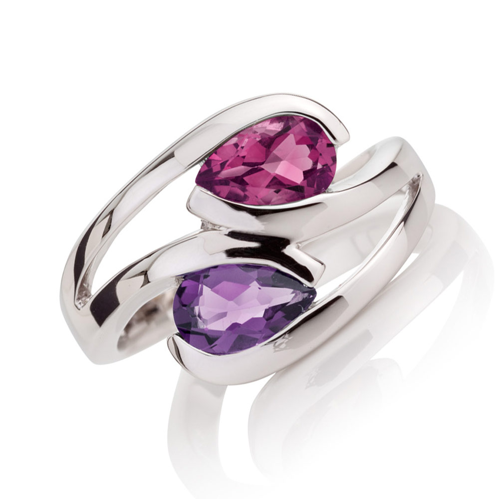 Rhodium plated 925 Sterling Silver cocktail ring set with 2 pear shaped gemstones. Choose from blue topaz and iolite combination or rhodolite and amethyst combination. Available in one sizes K-Q. Width: 14mm.