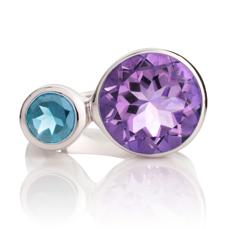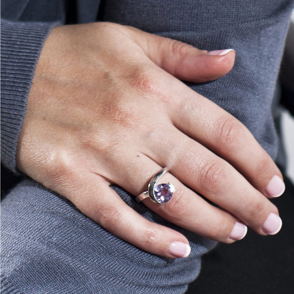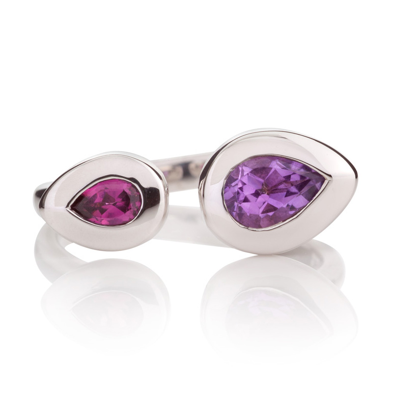 Rhodium plated 925 Sterling Silver cocktail ring set with a tear drop cut gemstone. Choose from smokey quartz, green amethyst & lemon quartz. Available in one sizes K-Q. Amethyst setting shown on model.
